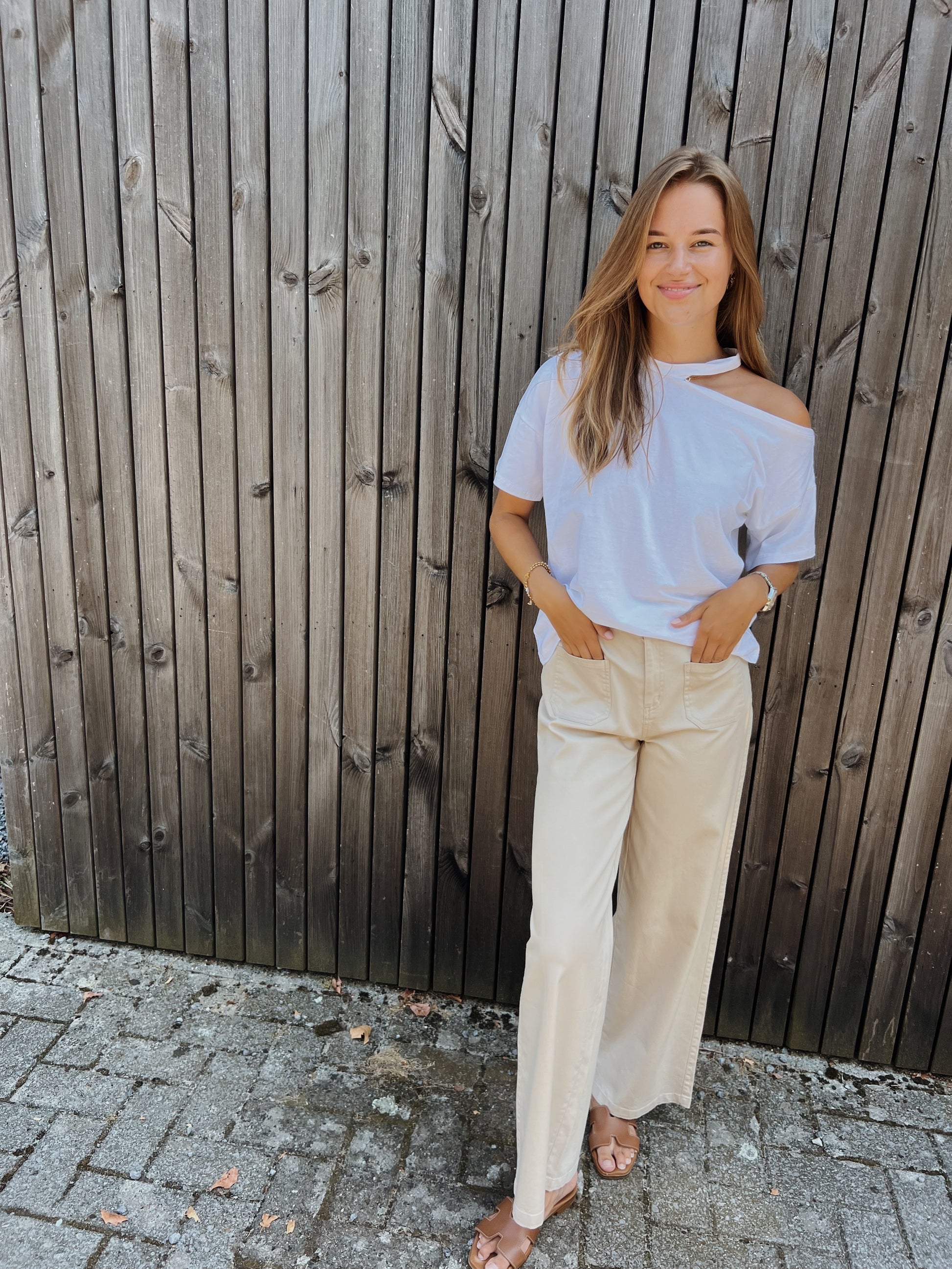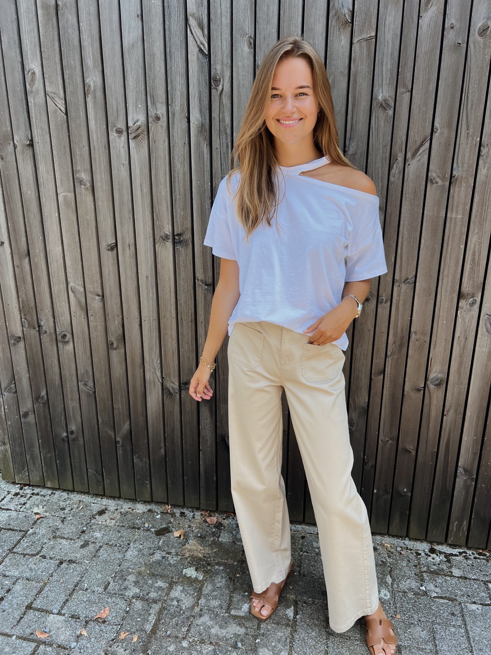 Onze Axana broek is een licht beige broek die heel goed mee rekt. Ze heeft ook een rekband in de heupen en heeft 2 leuke zakjes vooraan de broek.