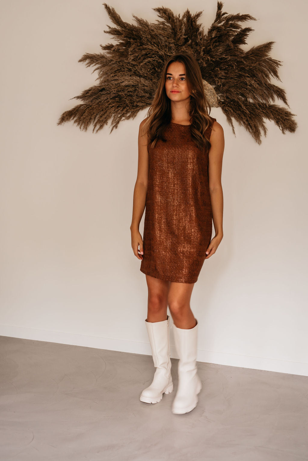 Een klassiek stijlvol jurkje afgewerkt met een lichte glitter. Ideaal al voor de feestdagen! Een toppertje op te dragen met hoge boots.