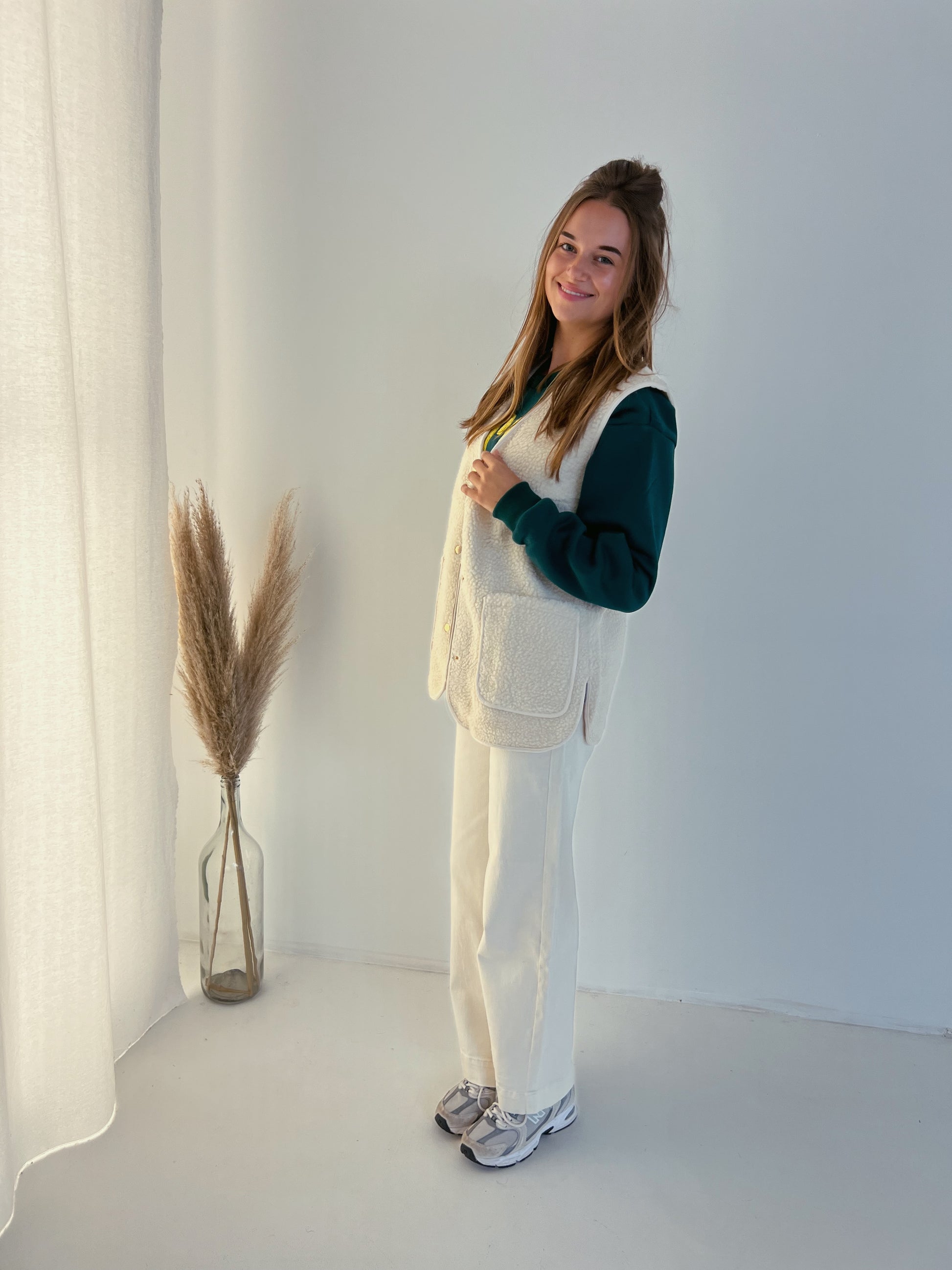 Onze Guusje teddy jack is een super tof teddy jasje zonder mouwen, deze heeft 2 zakjes en druk knoopjes. Super leuk op een jeanske te combineren maar ook op een leuke jurk is dit een toppertje.
