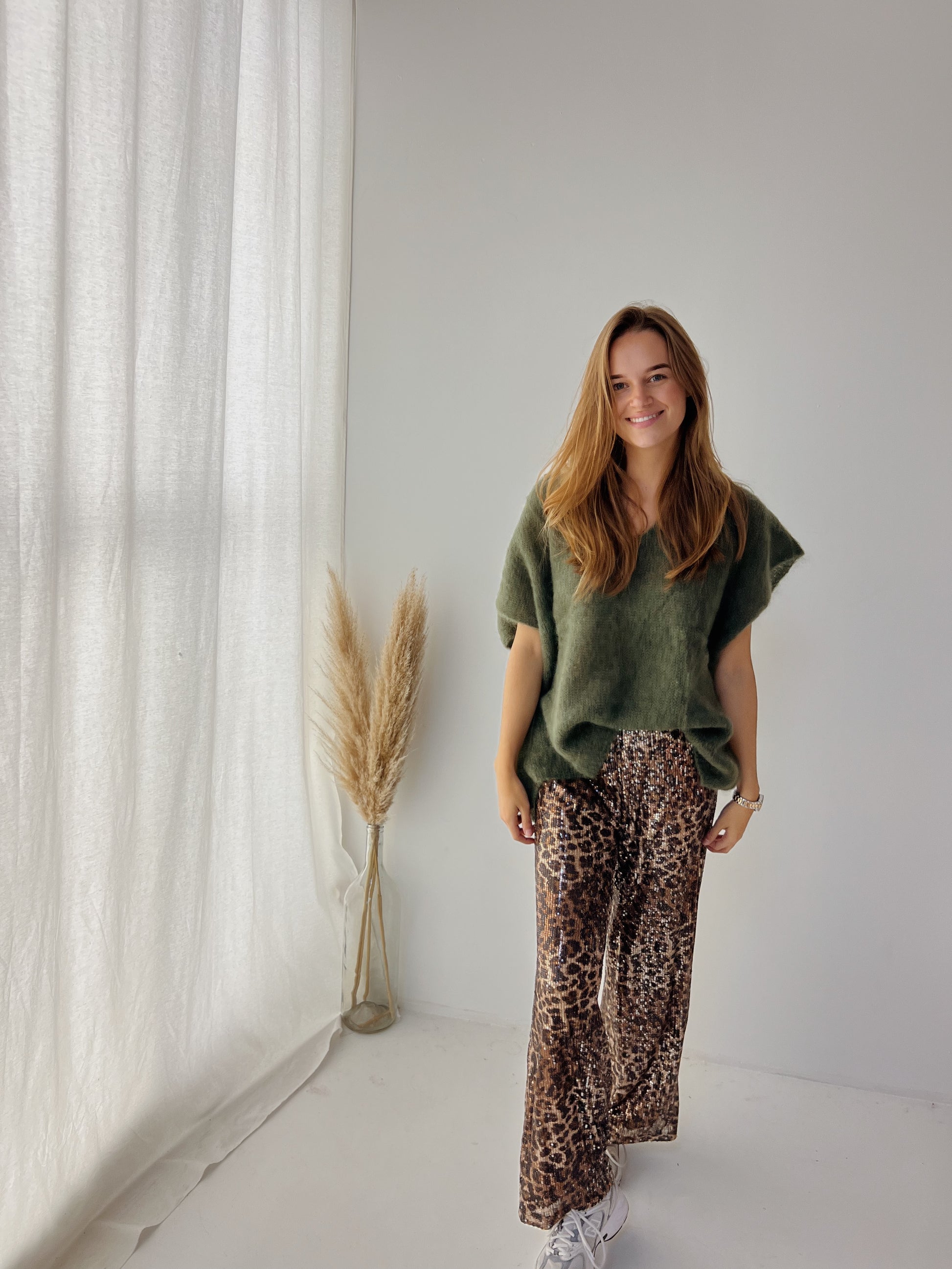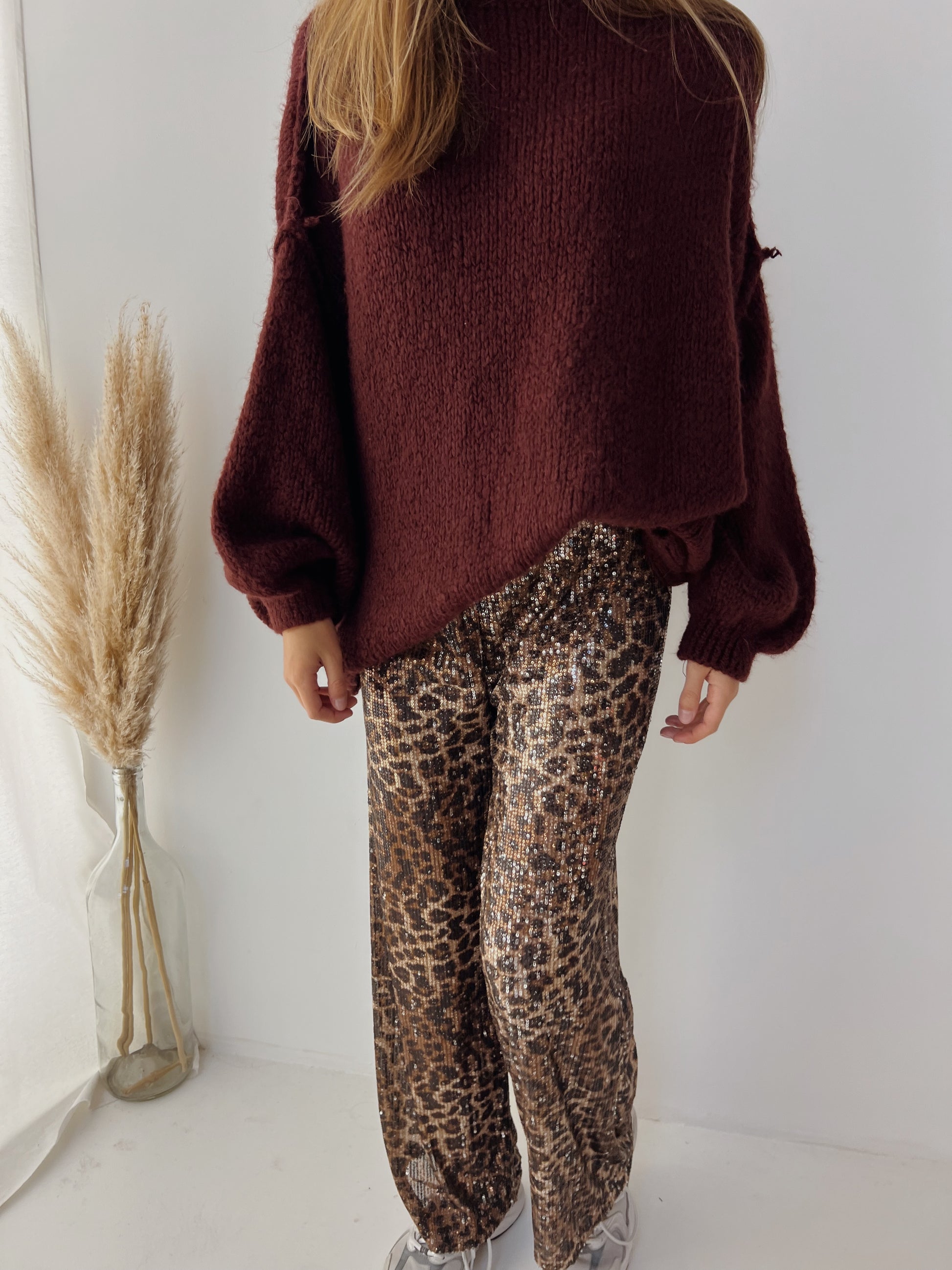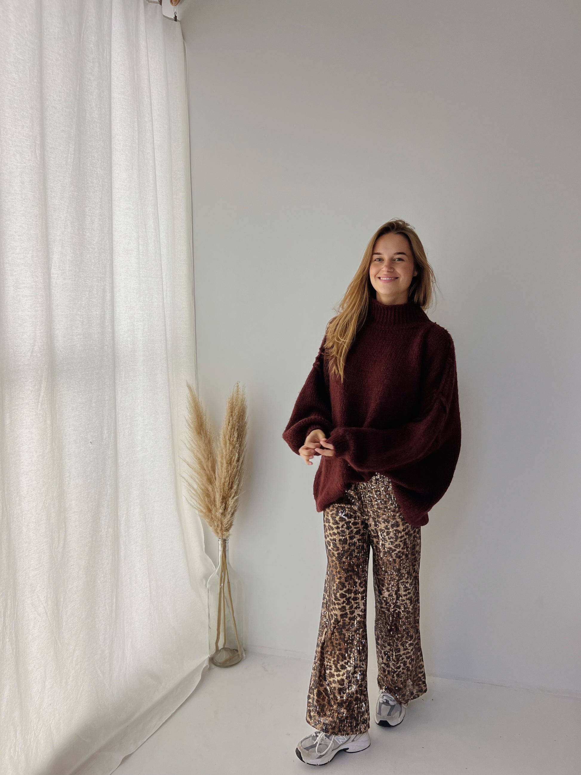 Onze Mette leopard trousers is een super tof broekje met glitters. Wide leg modelletje en vanbinnen een extra stofje zodat deze broek niet prikt. Prachtig te combineren met bordeaux.