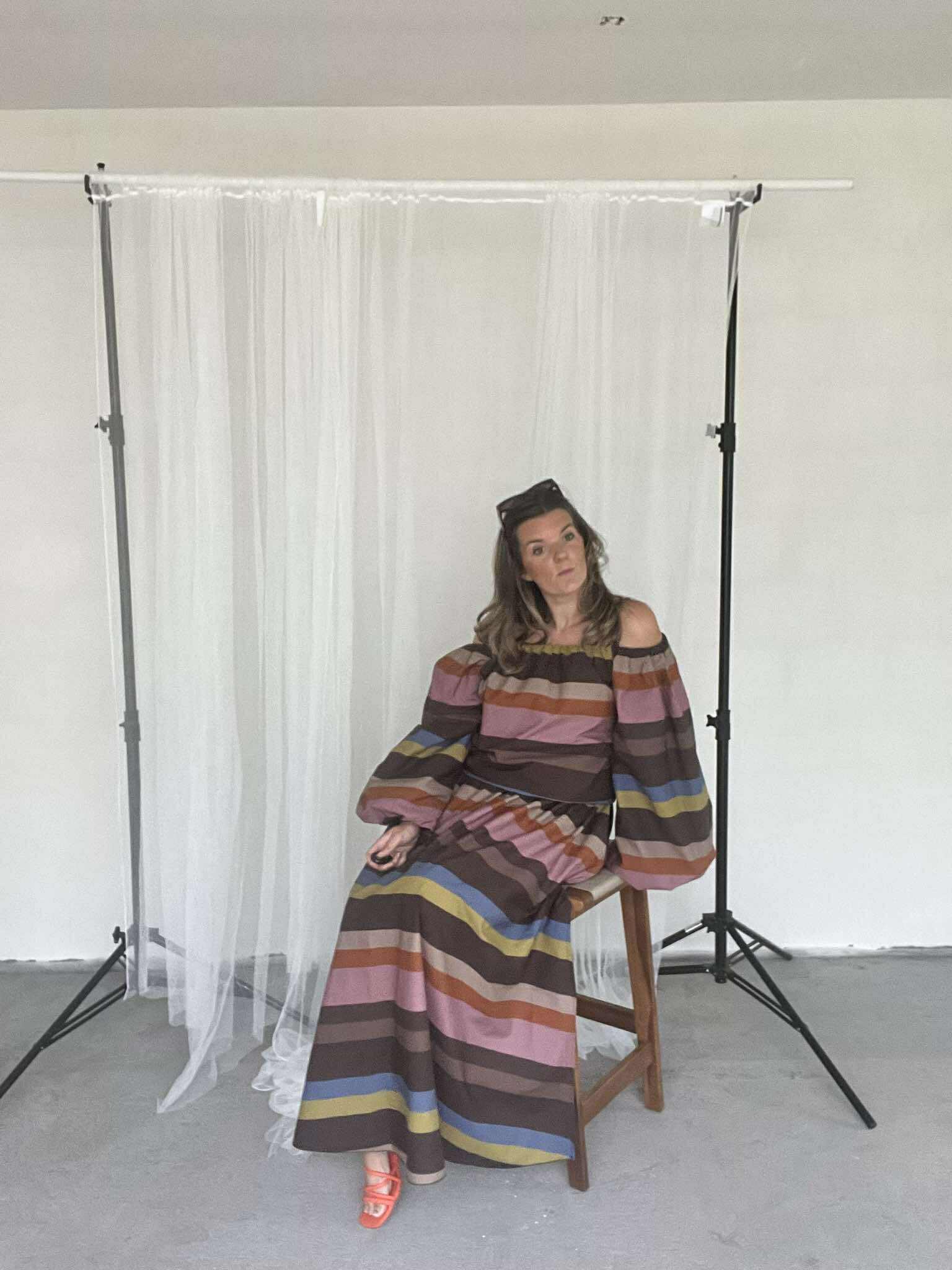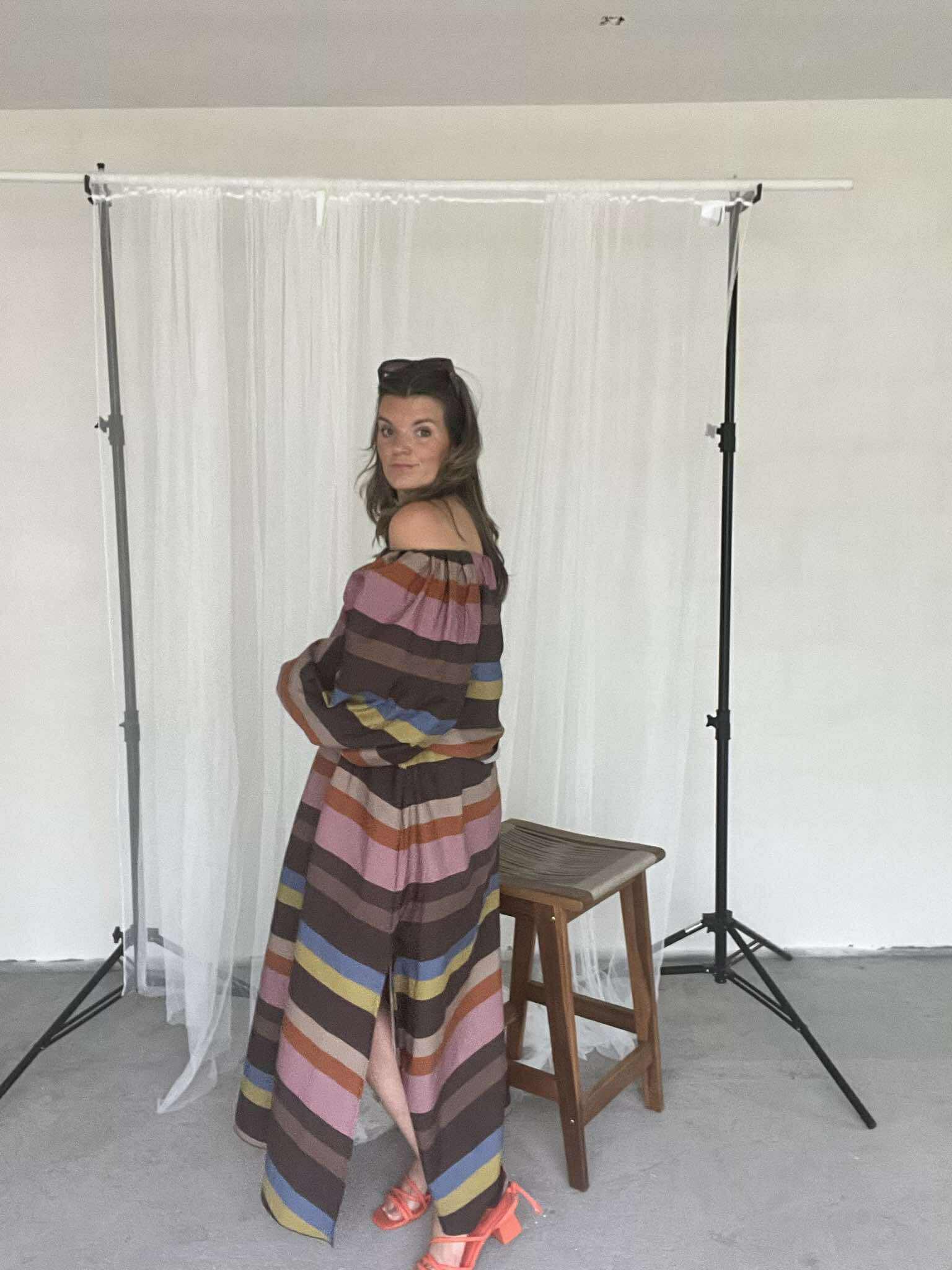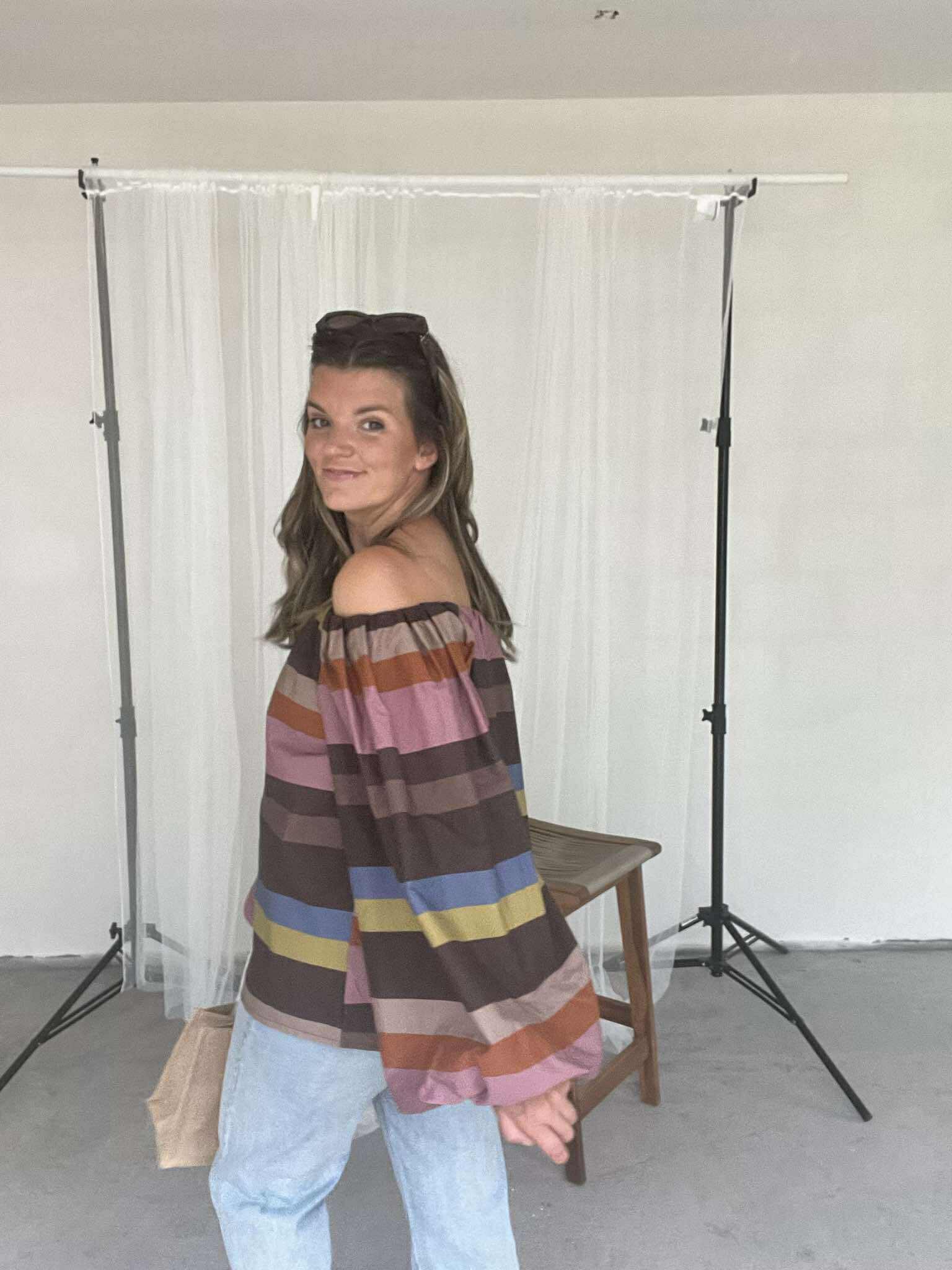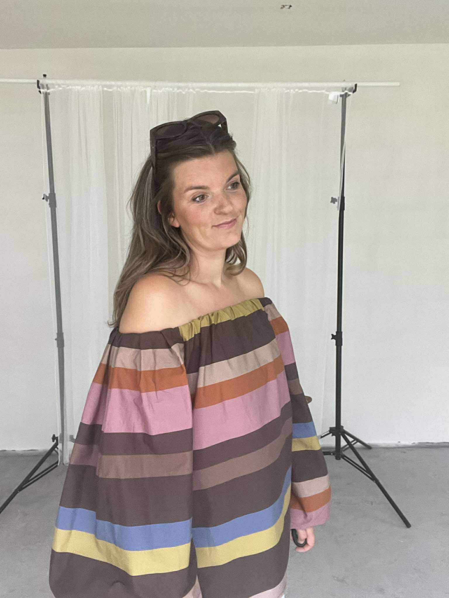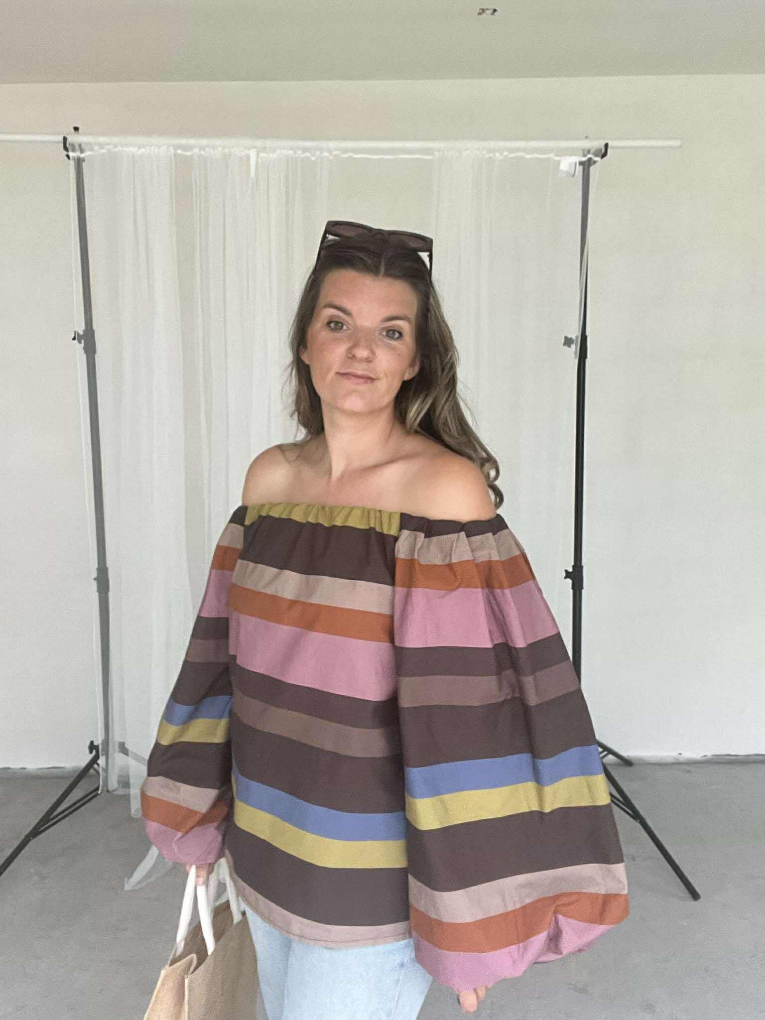 De Ravi blouse kan eindeloos gecombineerd worden. Deze off-shoulder blouse is heel mooi op zowel rokken als blouses, ook op een jeans is deze blouse heel stijlvol. Helemaal top is deze blouse gecombineerd met onze Juliana rok.