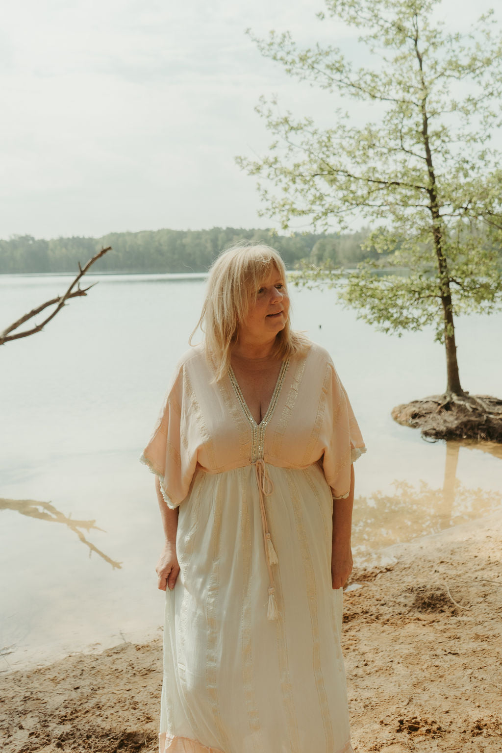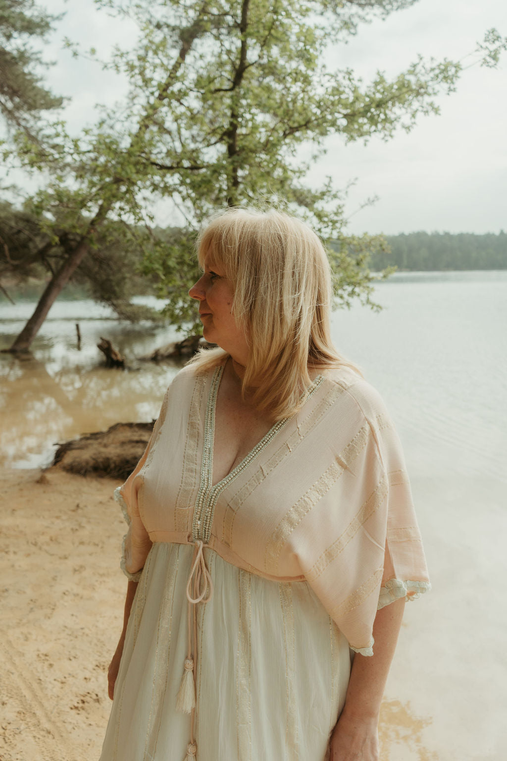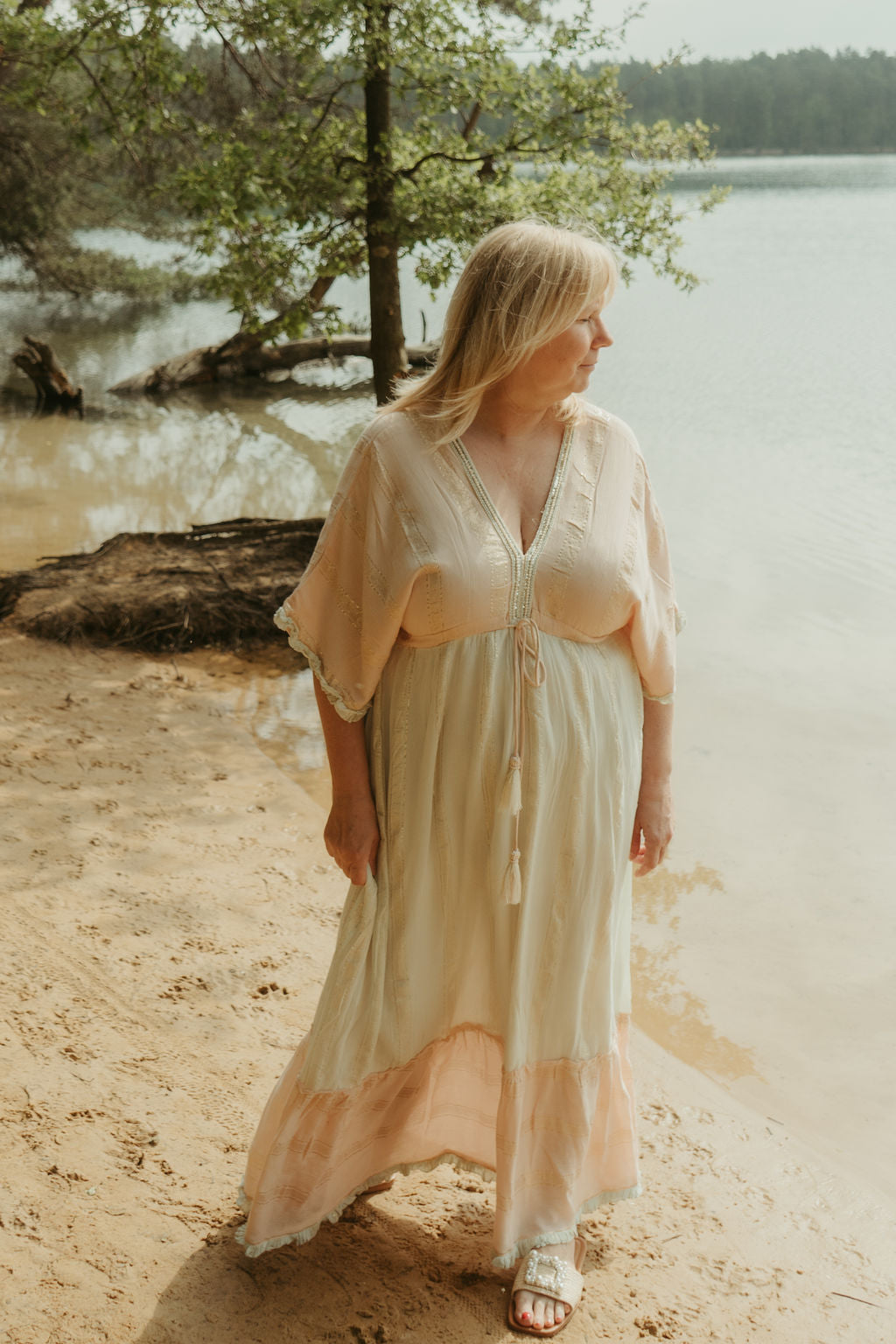 Deze zalmroze/ mintgroene Boho jurk is zalig om te dragen. Ze is mooi afgewerkt met kleine kraaltjes aan de V-neck. Deze jurk is ook achter op de rug open in een V.