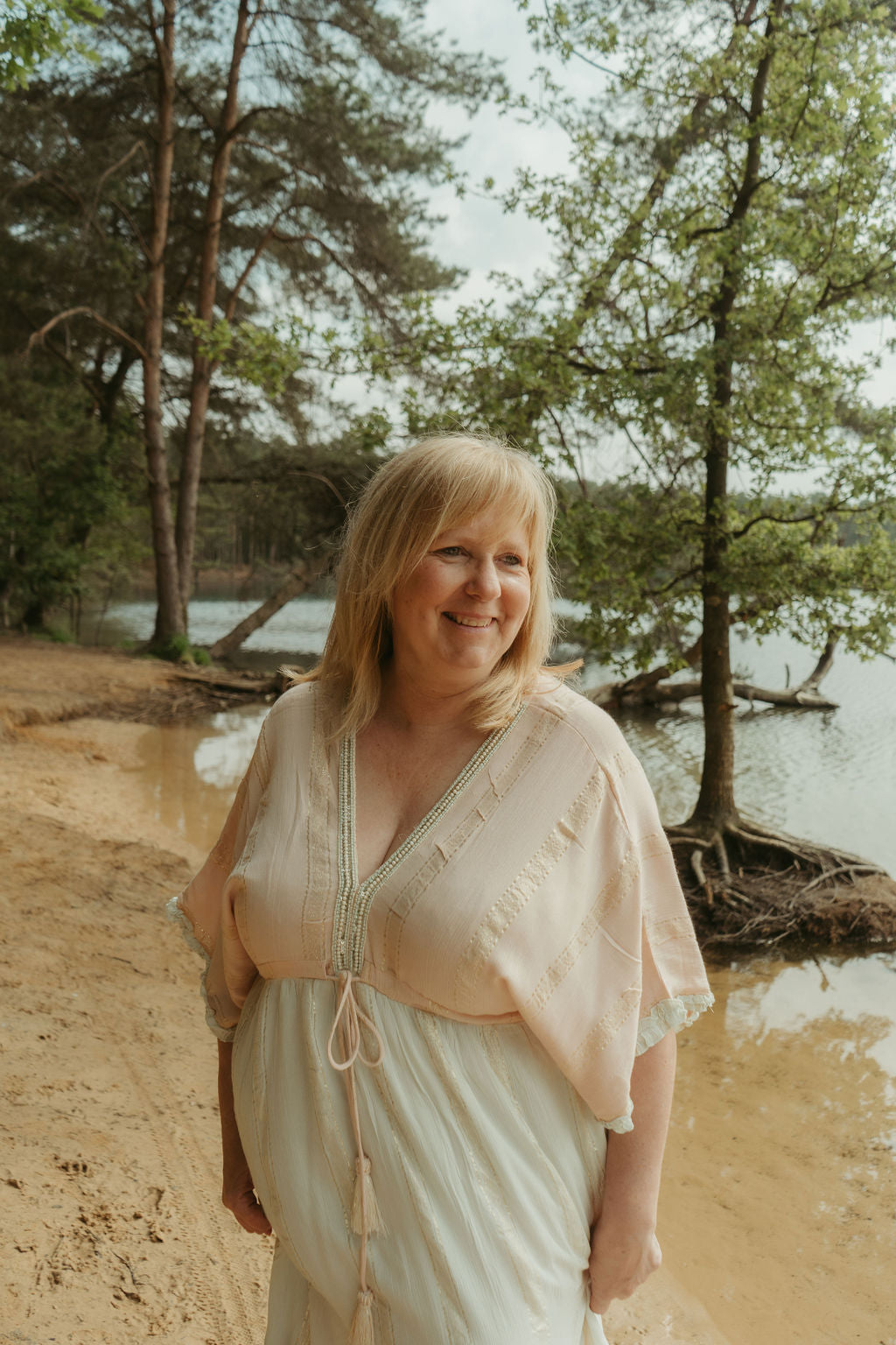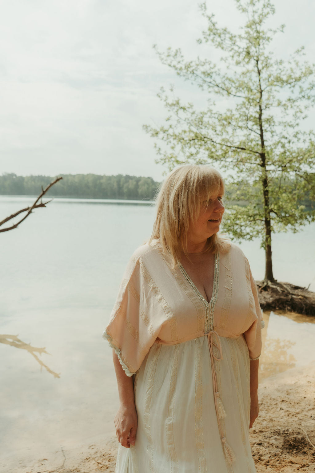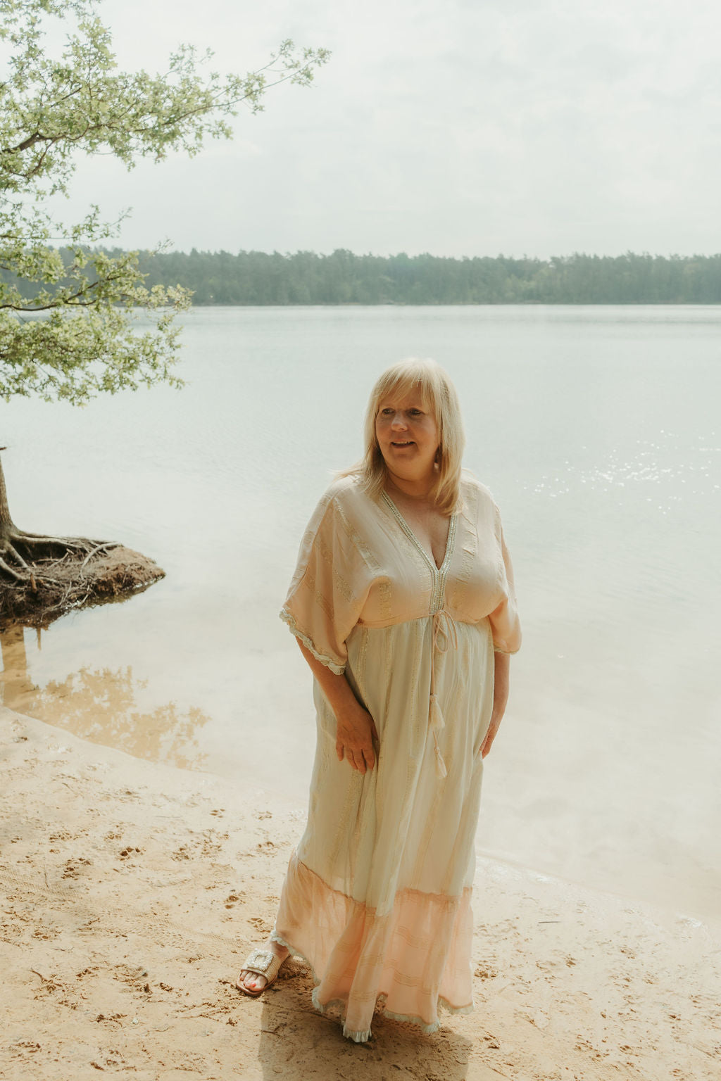 Deze zalmroze/ mintgroene Boho jurk is zalig om te dragen. Ze is mooi afgewerkt met kleine kraaltjes aan de V-neck. Deze jurk is ook achter op de rug open in een V.