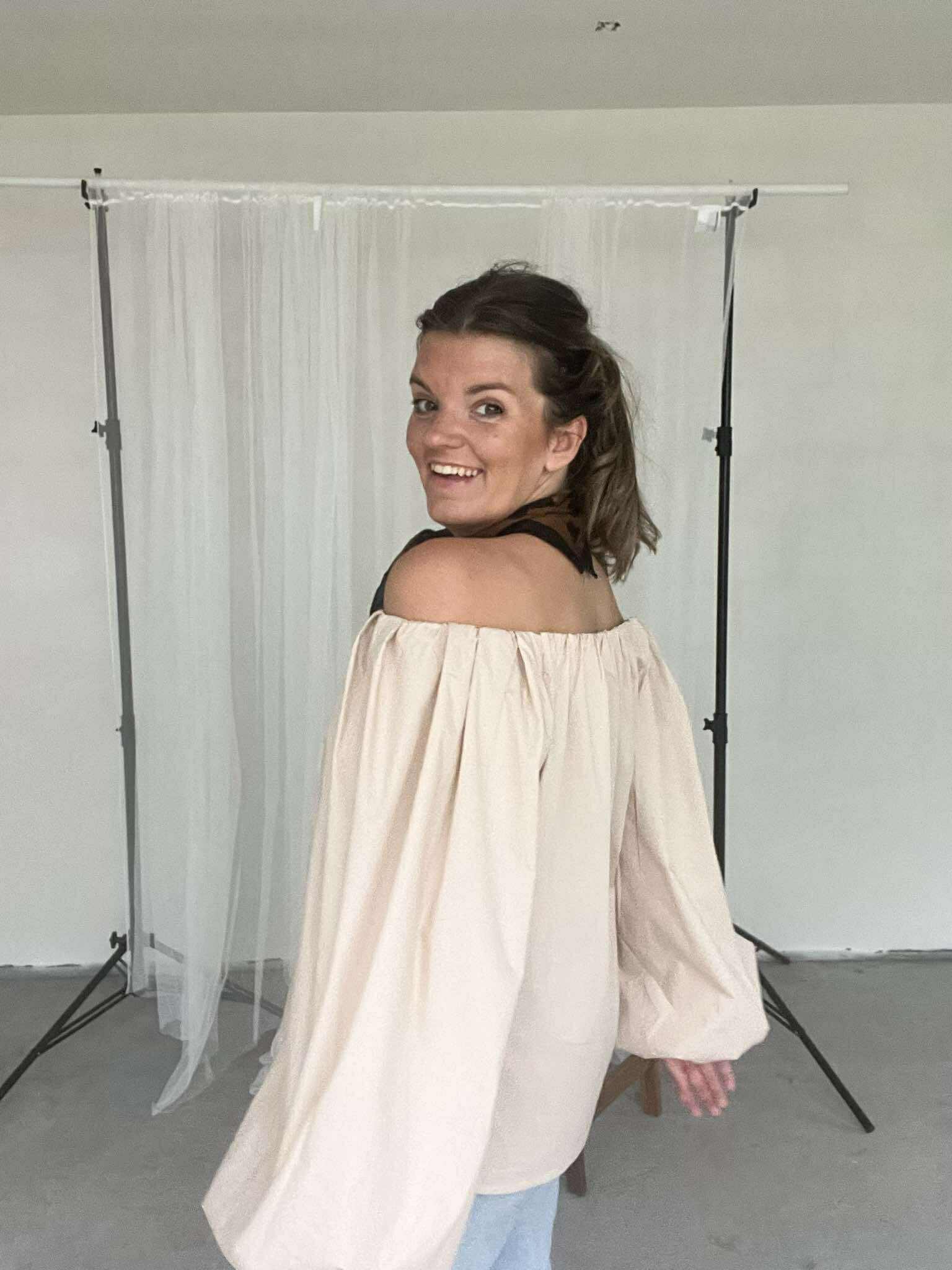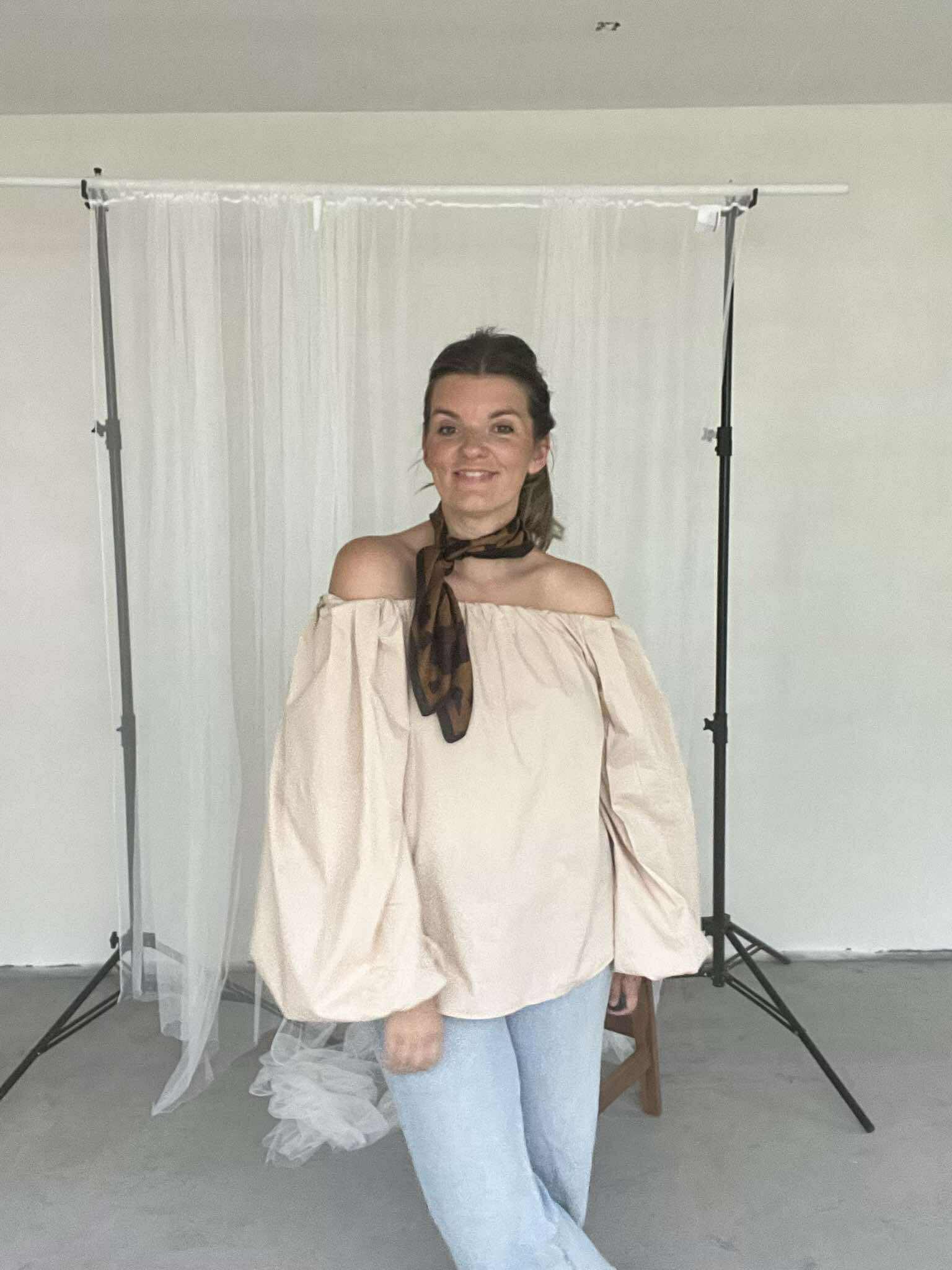 Onze Yena blouse is een off-shoulder blouse in een beige kleur.